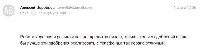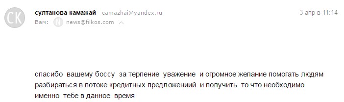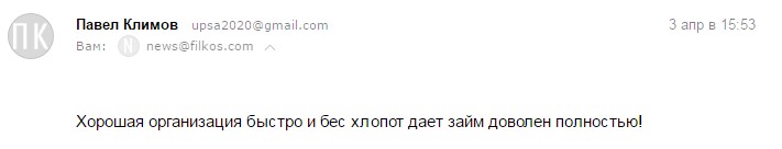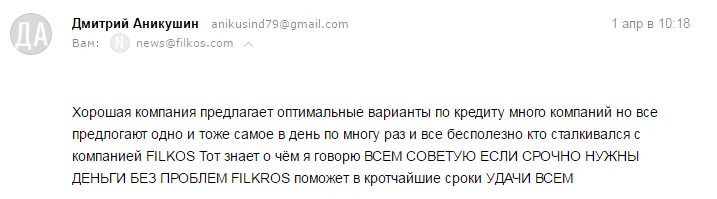 Хорошая компания и предлагает оптимальные варианты по кредиту. ВСЕМ СОВЕТУЮ, ЕСЛИ СРОЧНО НУЖНЫ ДЕНЬГИ БЕЗ ПРОБЛЕМ, FILKOS поможет в кротчайшие сроки.