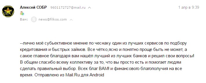 Мое мнение, это один из лучших сервисов по подбору кредитов и быстрых займов. Все чётко, ясно и понятно, проще быть не может, а самое главное: благодаря вам, нашёл лучший из лучших банков и решил свои вопросы! В общем спасибо всему коллективу за то, что вы просто есть и помогает людям сделать правильный выбор.