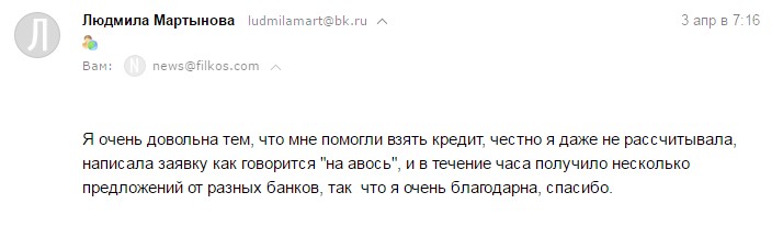 Я очень довольна тем, что мне помогли взять кредит. Честно, я даже не рассчитывала, написала заявку, как говорится "на авось" и в течение часа получила несколько предложений от разных банков. Спасибо.